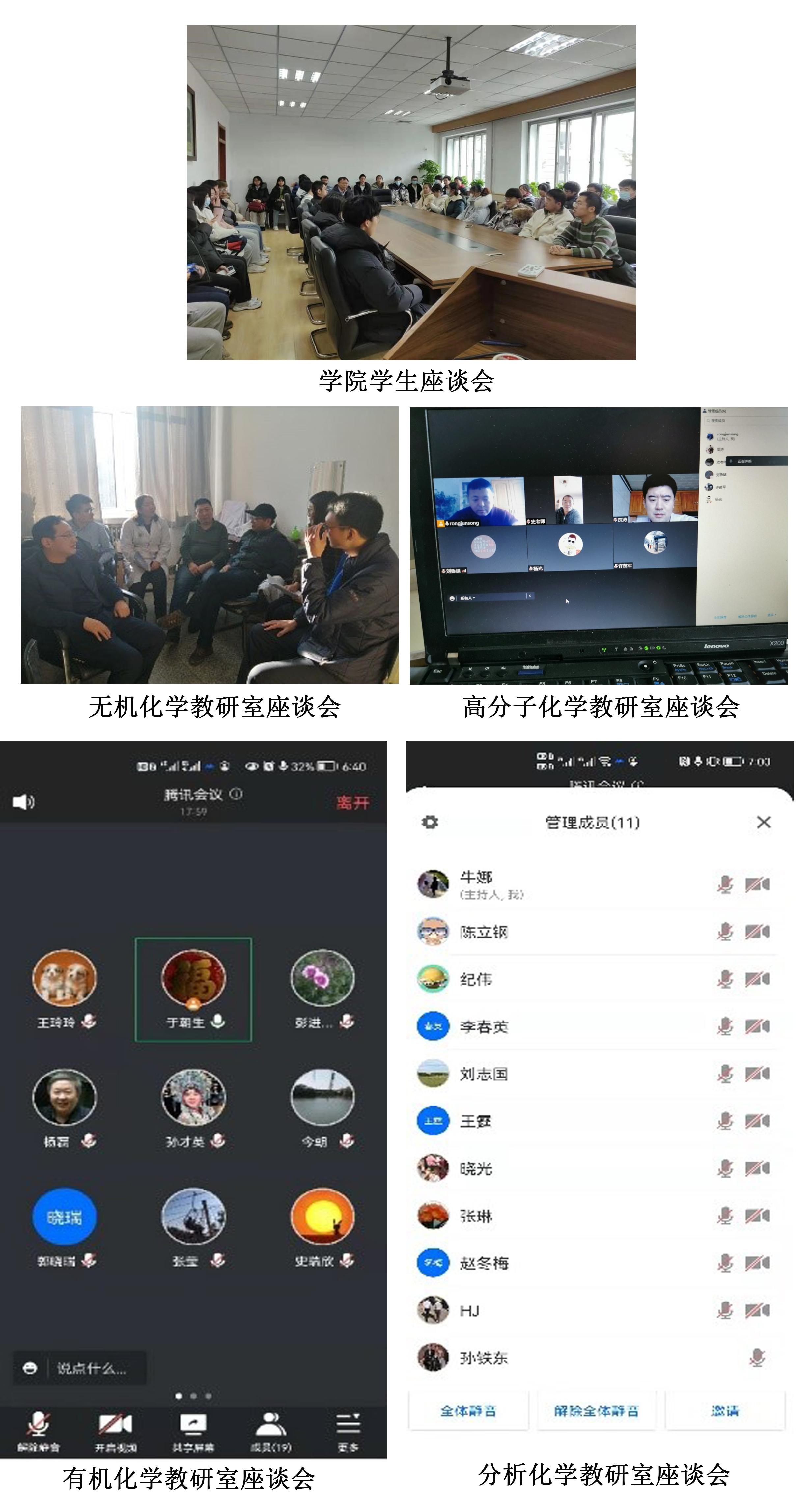 在此之前,无机化学教研室、有机化学教研室、分析化学教研室、物理化学教研室、高分子化学教研室也分别召集了本部门教师进行了期中座谈会。座谈会中,各教研室强调了疫情期间线上教学保证教学质量的重要性,组织多次听课活动并要求听课后进行反馈与研讨;详细讨论了在线课程及一流课程建设的相关规划细节;关注了新入职教师的岗前培训工作等。