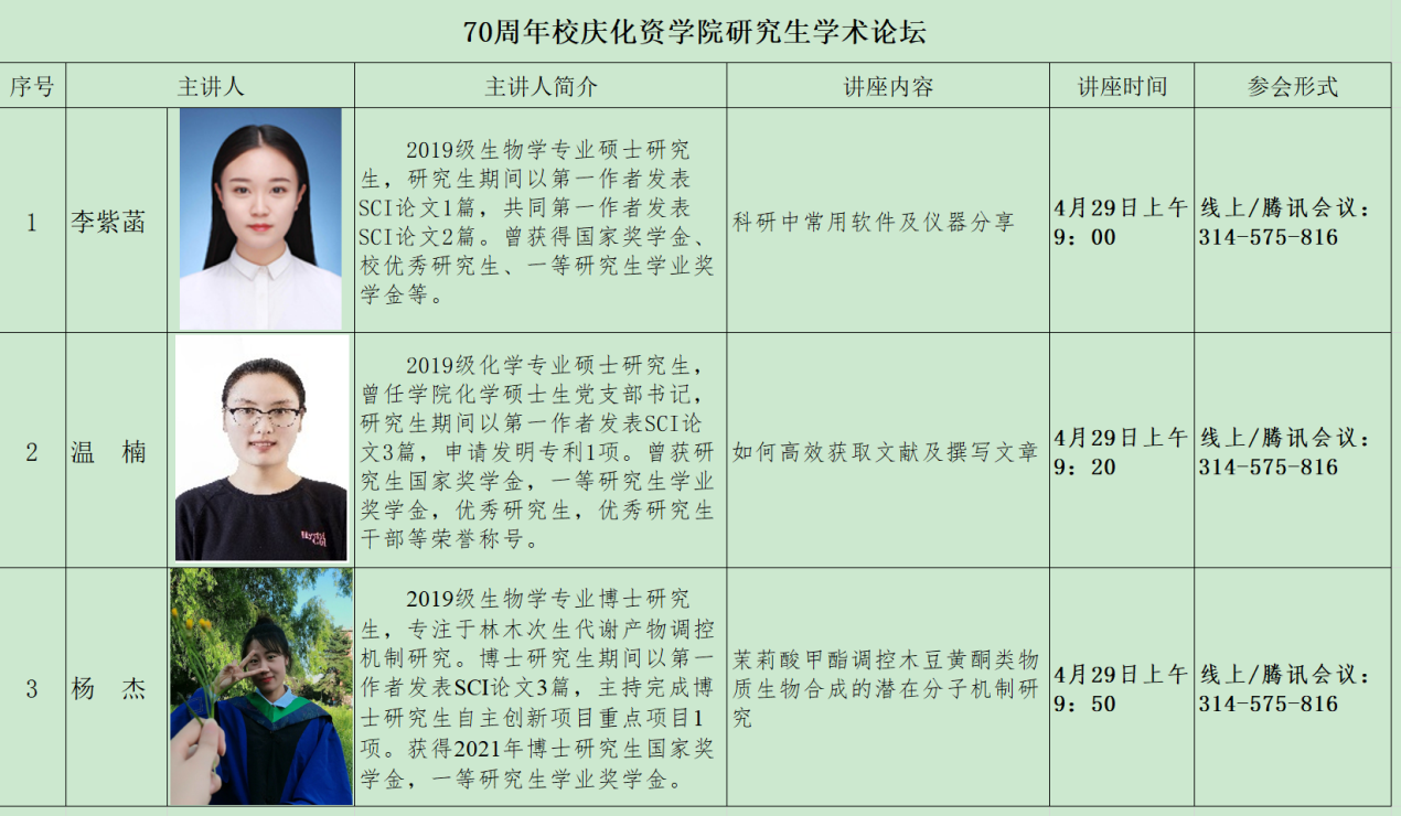 通过上述三场学术报告会,与会师生拓宽了学术视野,对于研究方向的凝练和提升具有积极的促进作用。5月份,公司将邀请澳大利亚南昆士兰大学宋平安教授、黑龙江大学宋富强教授、中国科公司沈阳应用生态研究所孙涛研究员、南开大学石福臣教授、清华大学梁琼麟教授、吉林大学宋大千教授、上海科技大学高得伟教授,为大家带来精彩的校庆学术报告。