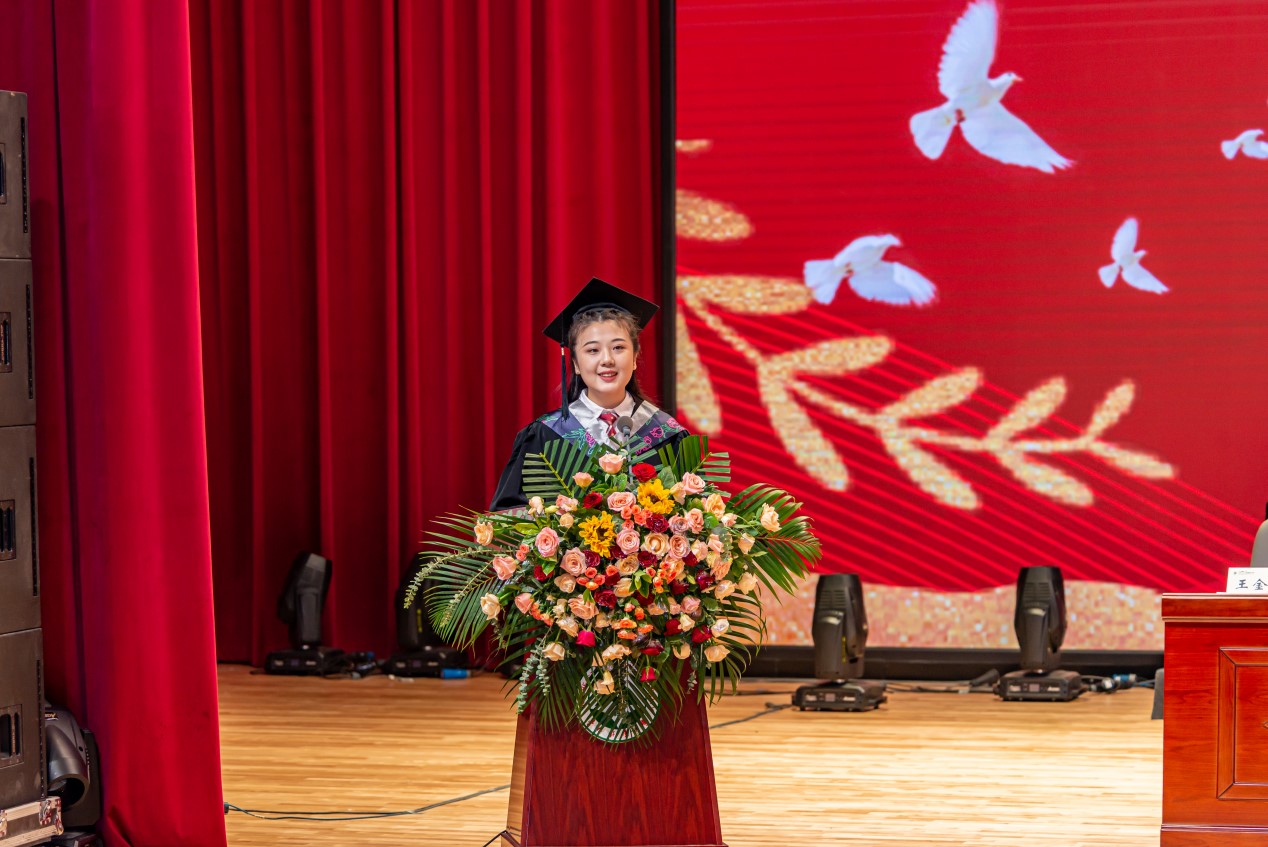 “追风赶月莫停留,平芜尽处是春山”。在典礼第四项毕业生代表发言环节,本科毕业生张铭溪同学围绕“前行”二字,与在场师生分享了她在BETVICTOR伟德四年的逐梦经历。公司的悉心栽培、老师的诲人不倦、辅导员的无微不至、挚友的关怀包容,皆成为前行之路上的光亮。她向公司、老师们以及全体毕业生献上美好的祝福:祝愿母院春风化雨育英才,硕果飘香谱华章;祝愿老师们身体健康、桃李满园;祝愿全体毕业生同学前程似锦、万事胜意。