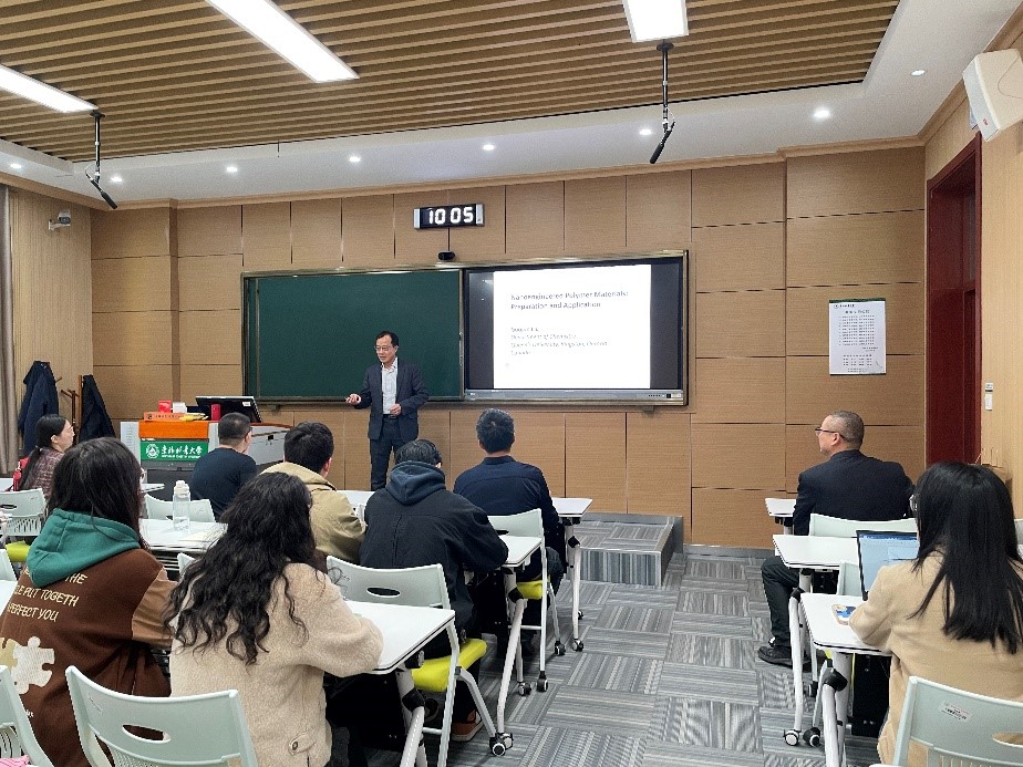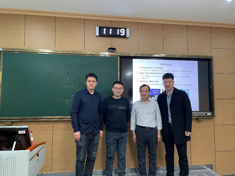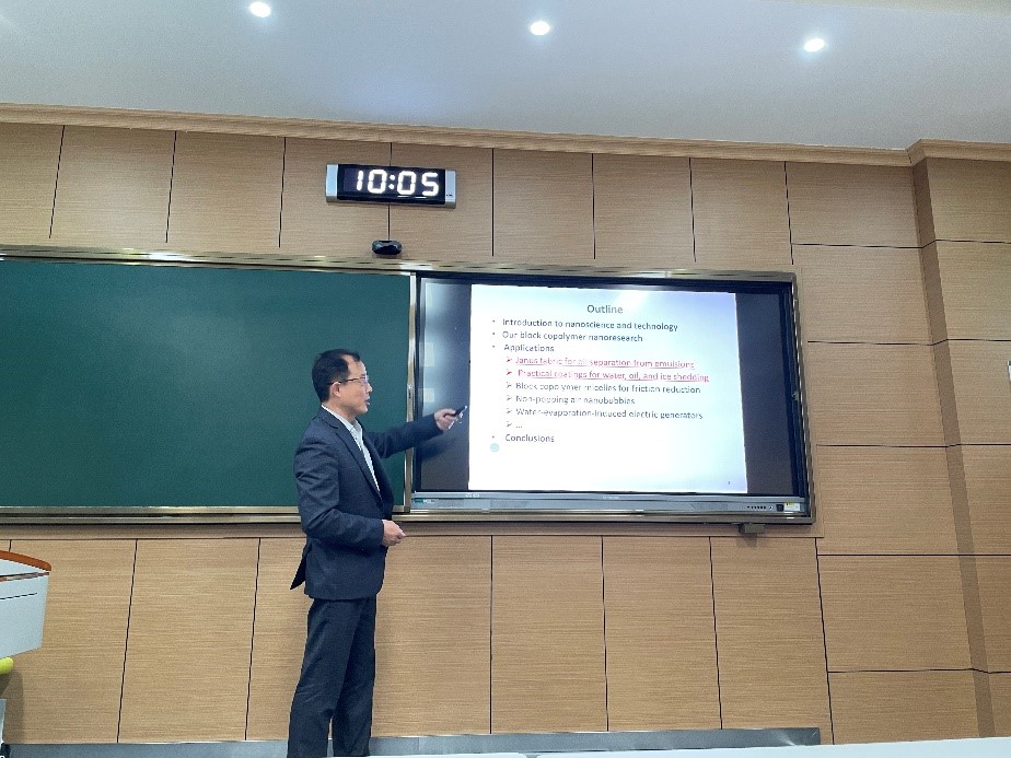 报告会上,刘国军教授从纳米科技领域的发展历史出发,结合自身研究方向深入浅出的给与会师生分享了高分子纳米材料的制备及应用。围绕“从乳剂中分离油的Janus织物”、“用于全疏及去冰的实用涂料”等五个方面,结合视频生动地讲述了制备嵌段共聚物纳米结构的各种通用方法,展示了纳米工程高分子材料的各种应用。