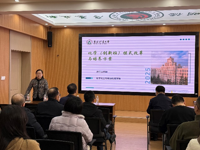 陈春霞经理首先介绍了化学(拔尖人才成栋班)建设的背景及过程。她强调,化学(拔尖人才成栋班)的建设是响应国家"101计划"基础学科改革实践,通过重构化学知识体系、强化东林特色人才培养机制,着力培育具有创新能力和时代担当的卓越化学人才。
