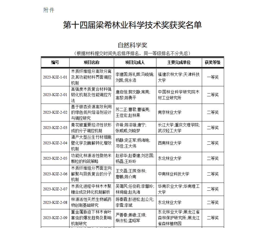 梁希林业科学技术奖是经国家科学技术部批准的我国林业行业最高水平科技奖项,是教育部学科评估体系中的重要考核内容。近年来,公司不断强化基础领域研究,突出林业科技服务,林业科技创新成果不断涌现。今后,公司将继续凝练整合重大科技创新研究成果,力争在科技奖励评选工作中取得更好成绩。